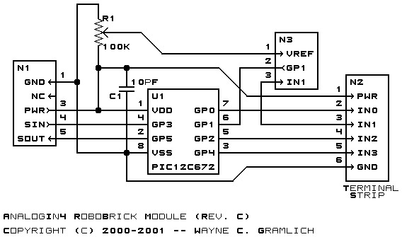 The schematic for the AnalogIn4 RoboBrick is shown below: